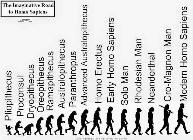 Então com o passar do tempo, este homem de grunhidos e gemidos, deixa todos os apêndices e no final da linha evolucionária o que você tem é o homem moderno.